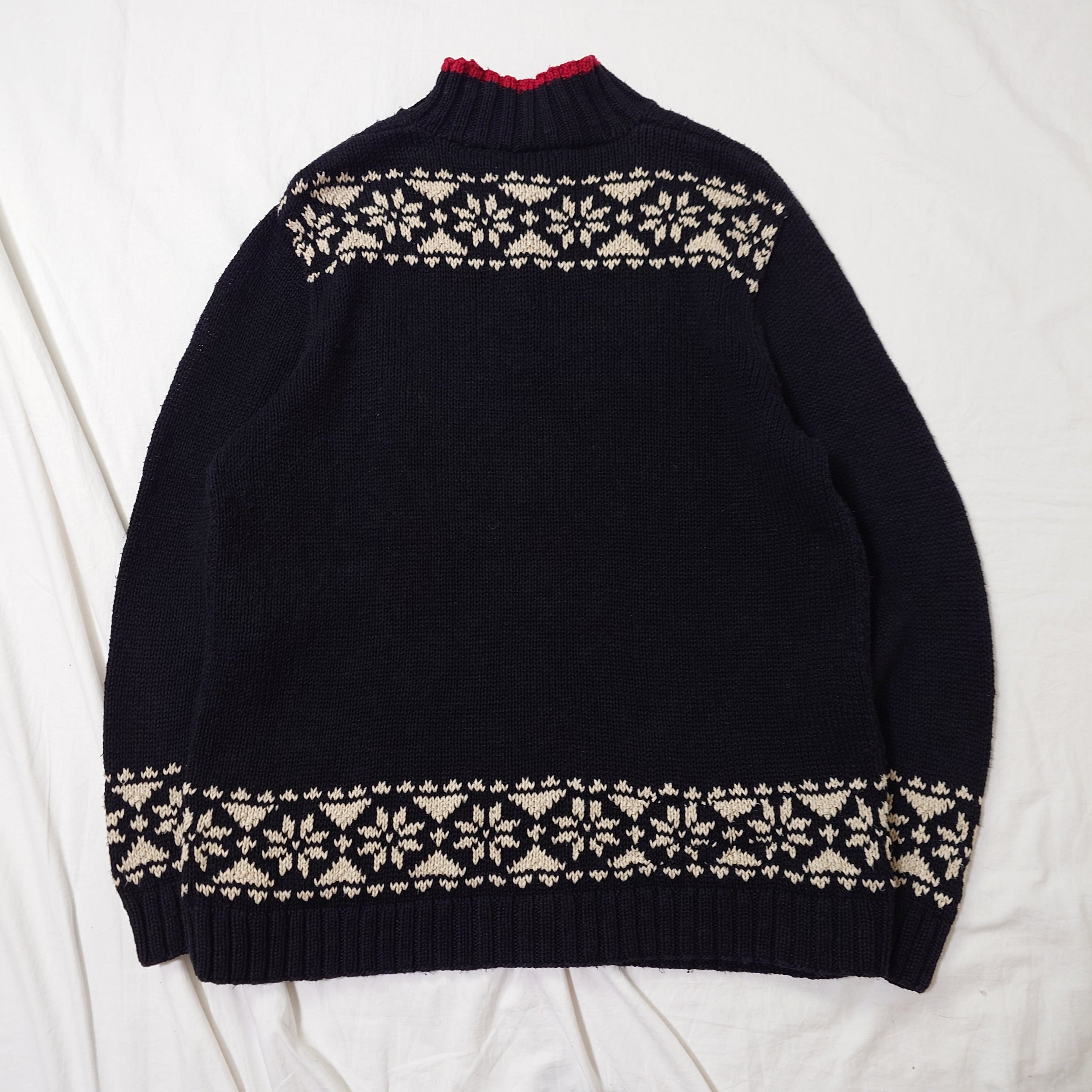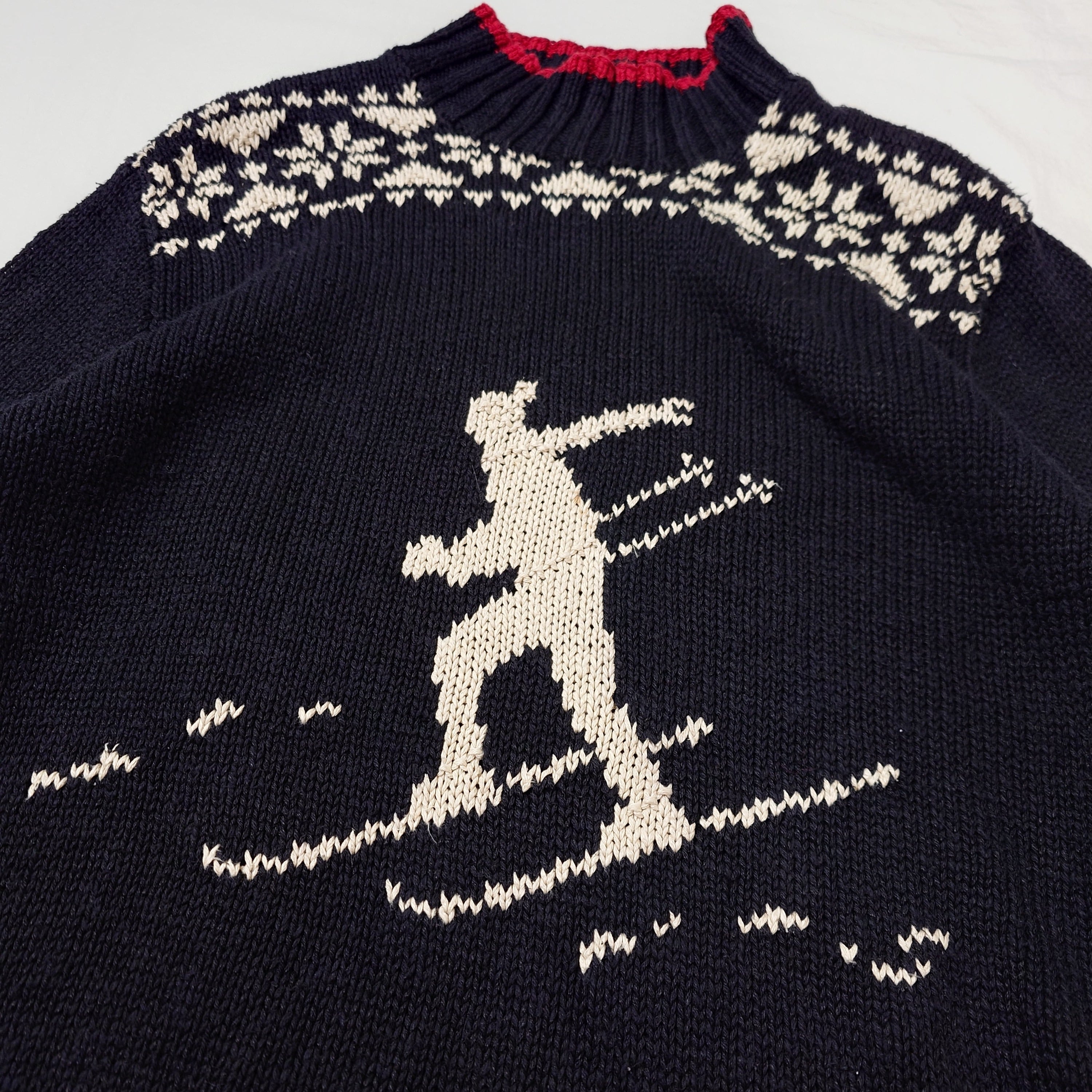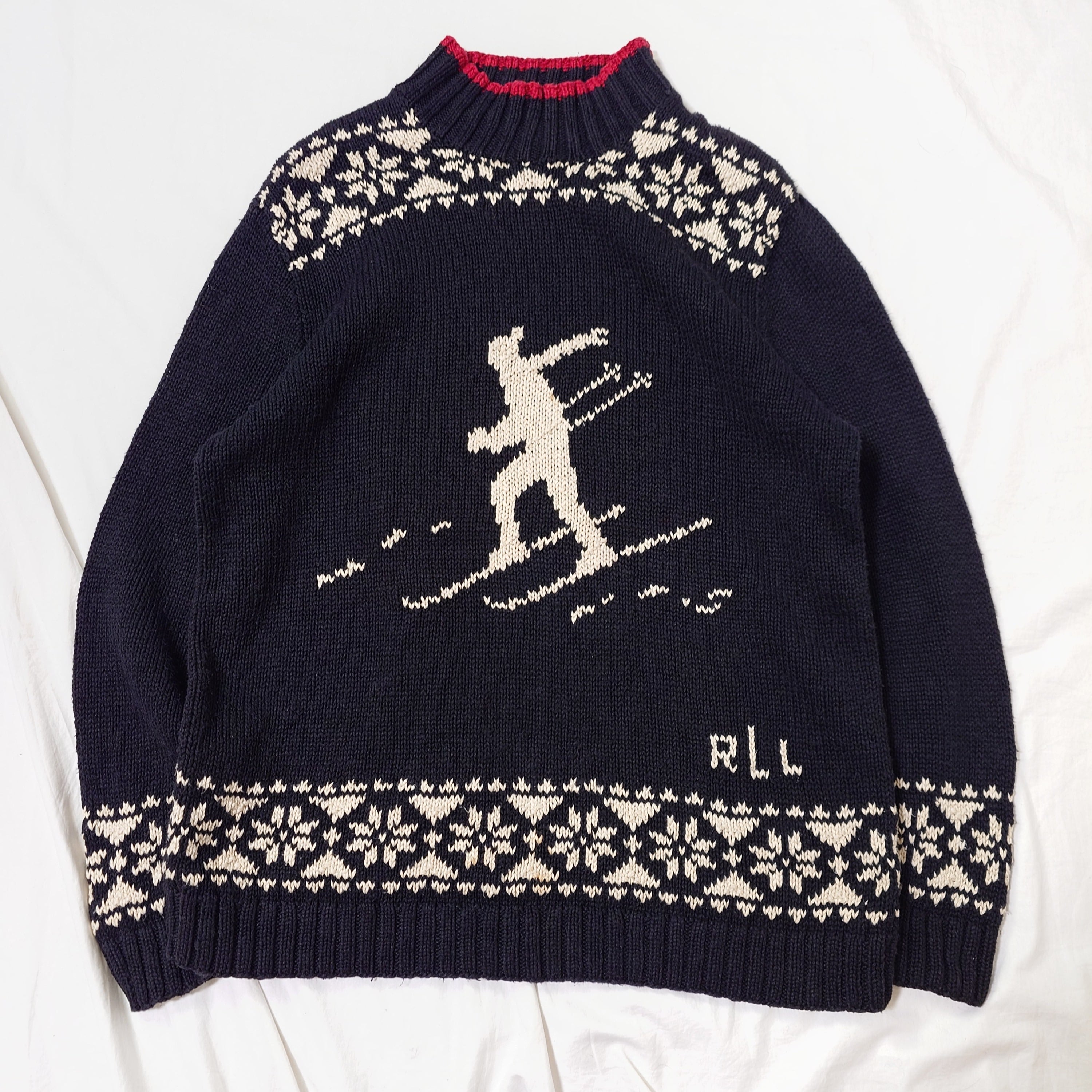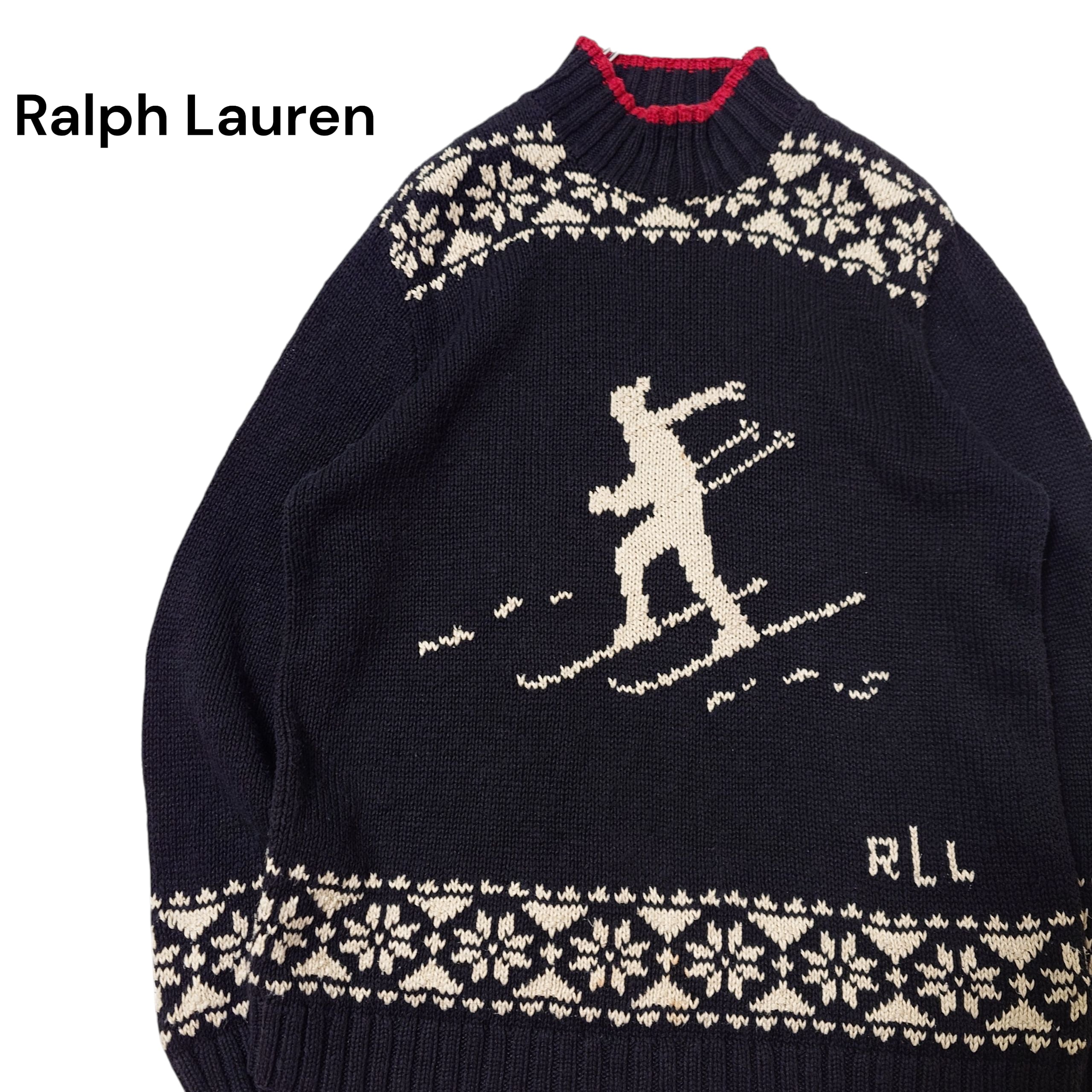 【80s】Ralph Lauren ラルフローレン スキー柄 コットンニット ブラック モックネック ノルディック ヴィンテージ リネン 古着