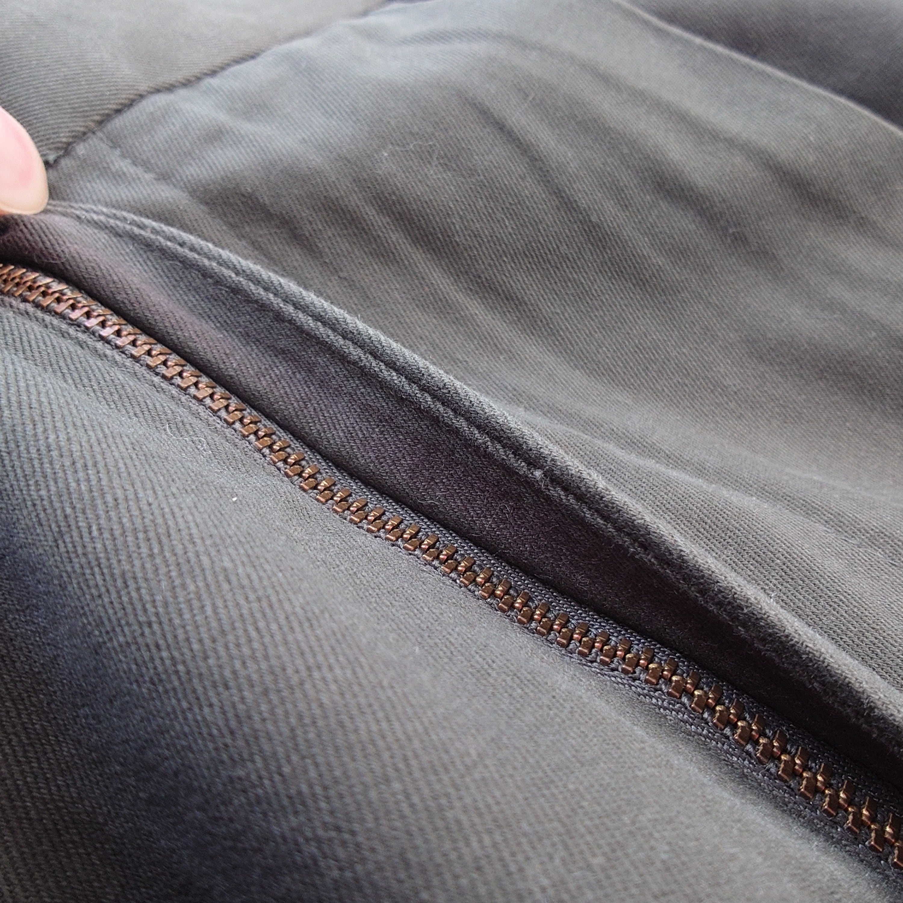 There is some staining around the zipper area and natural fading typical of cotton garments.