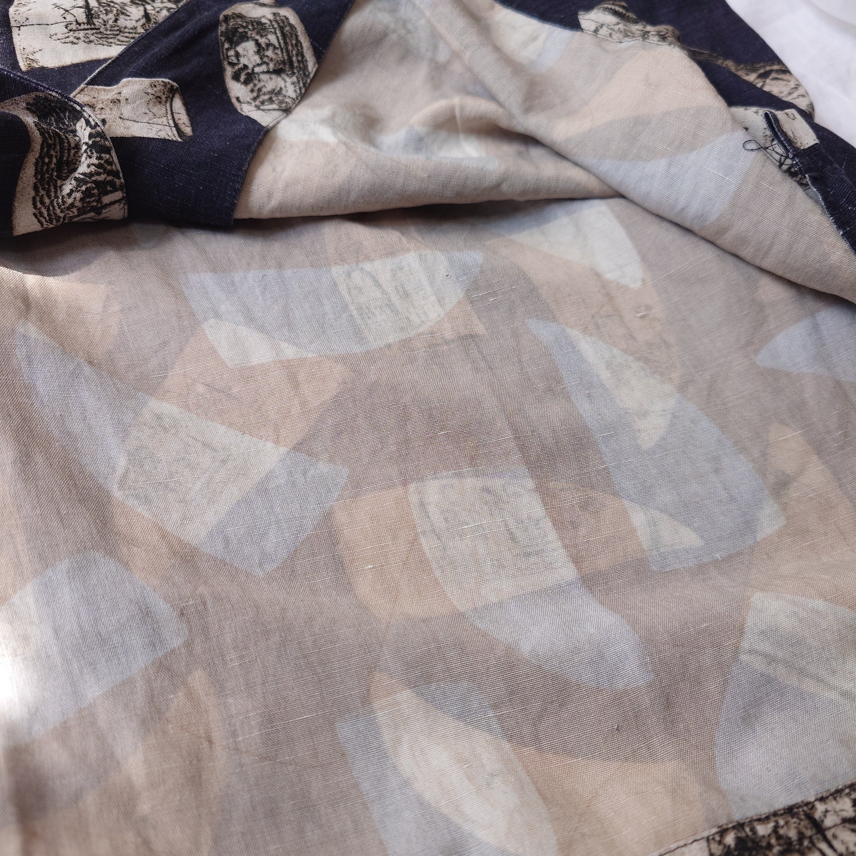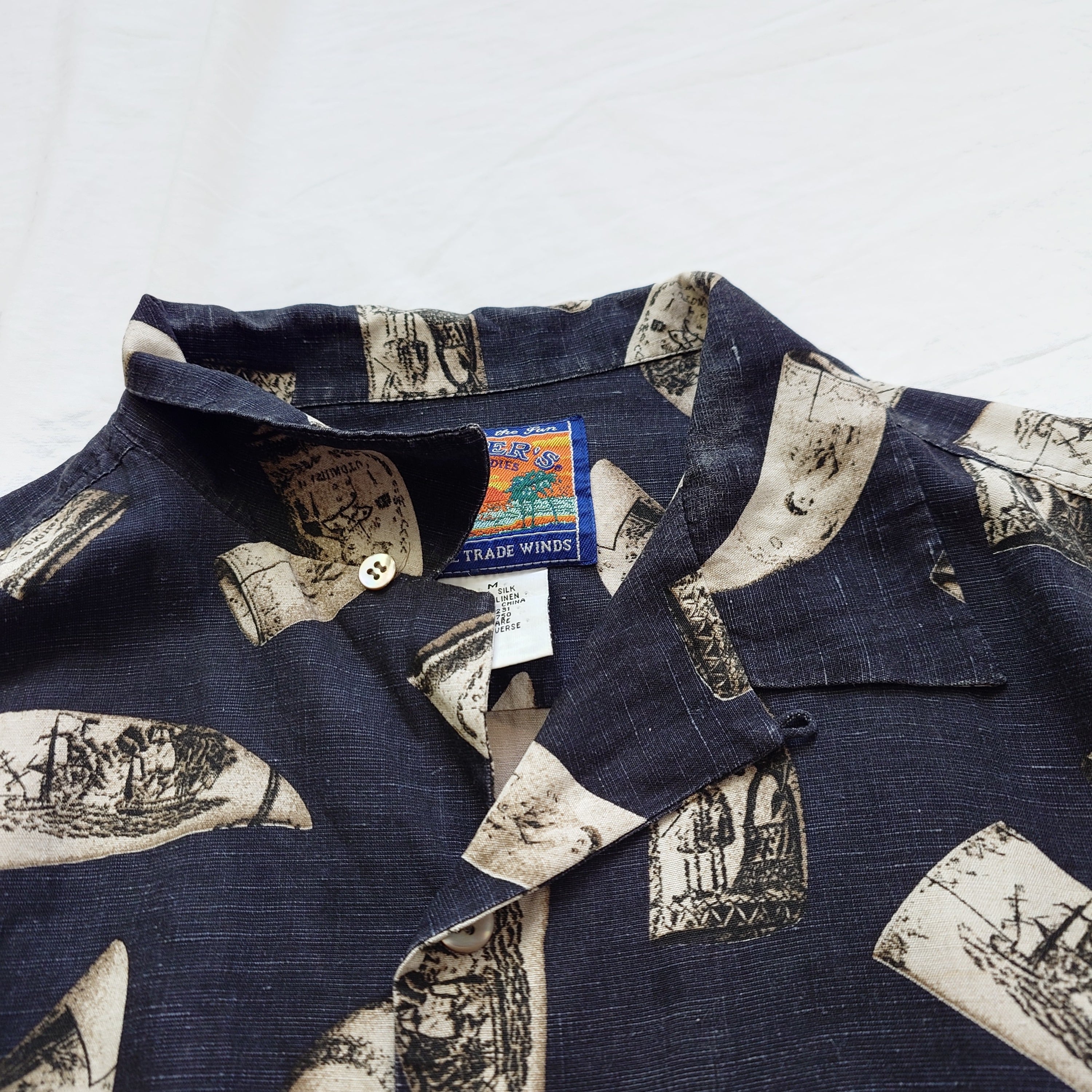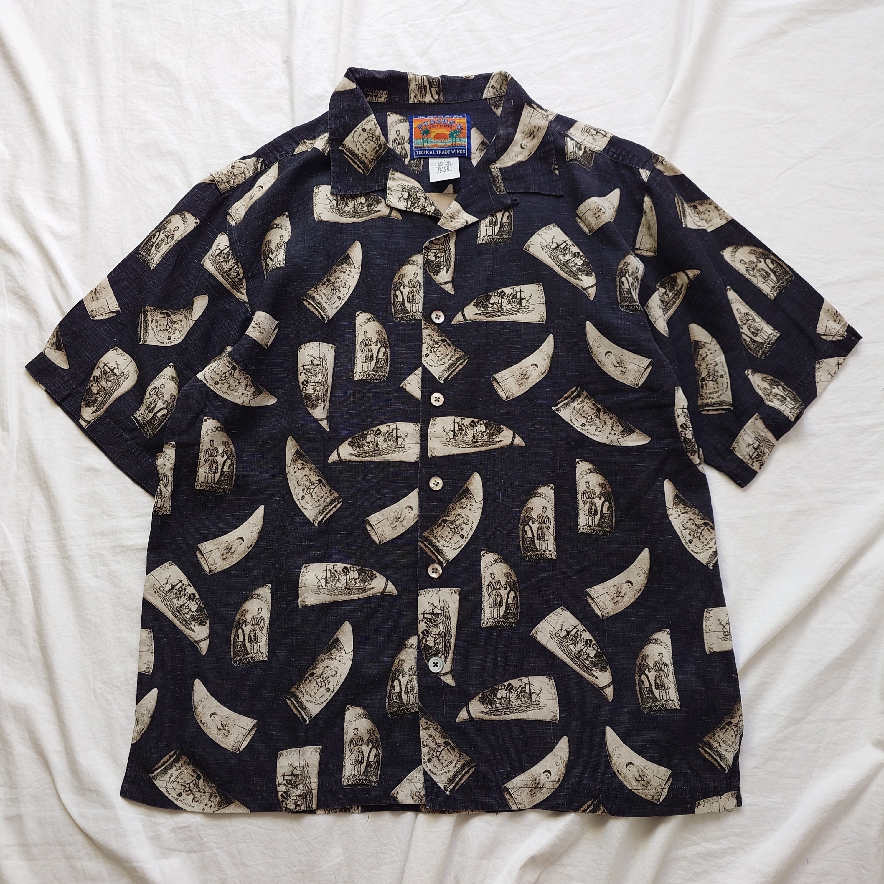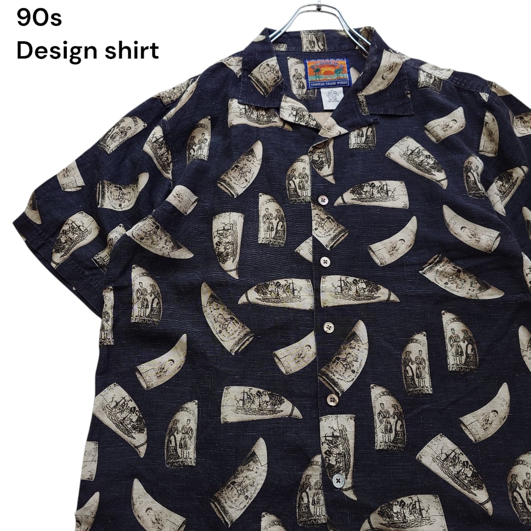 【90s】総柄開襟シャツ シルクリネン オープンカラー 古着 ボックスシルエット ブラック 黒 夏服