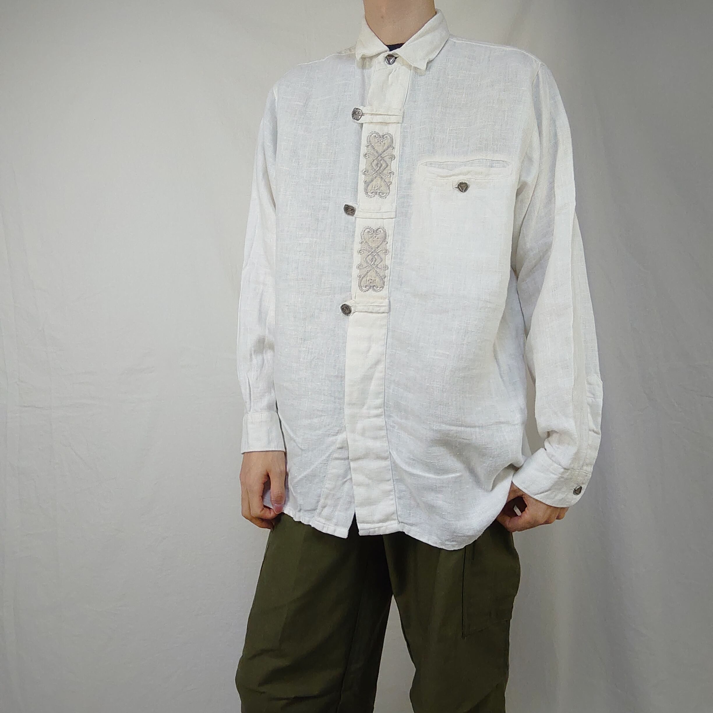 【リネン100】Tyrolean shirt チロリアンシャツ ホワイト 刺繍