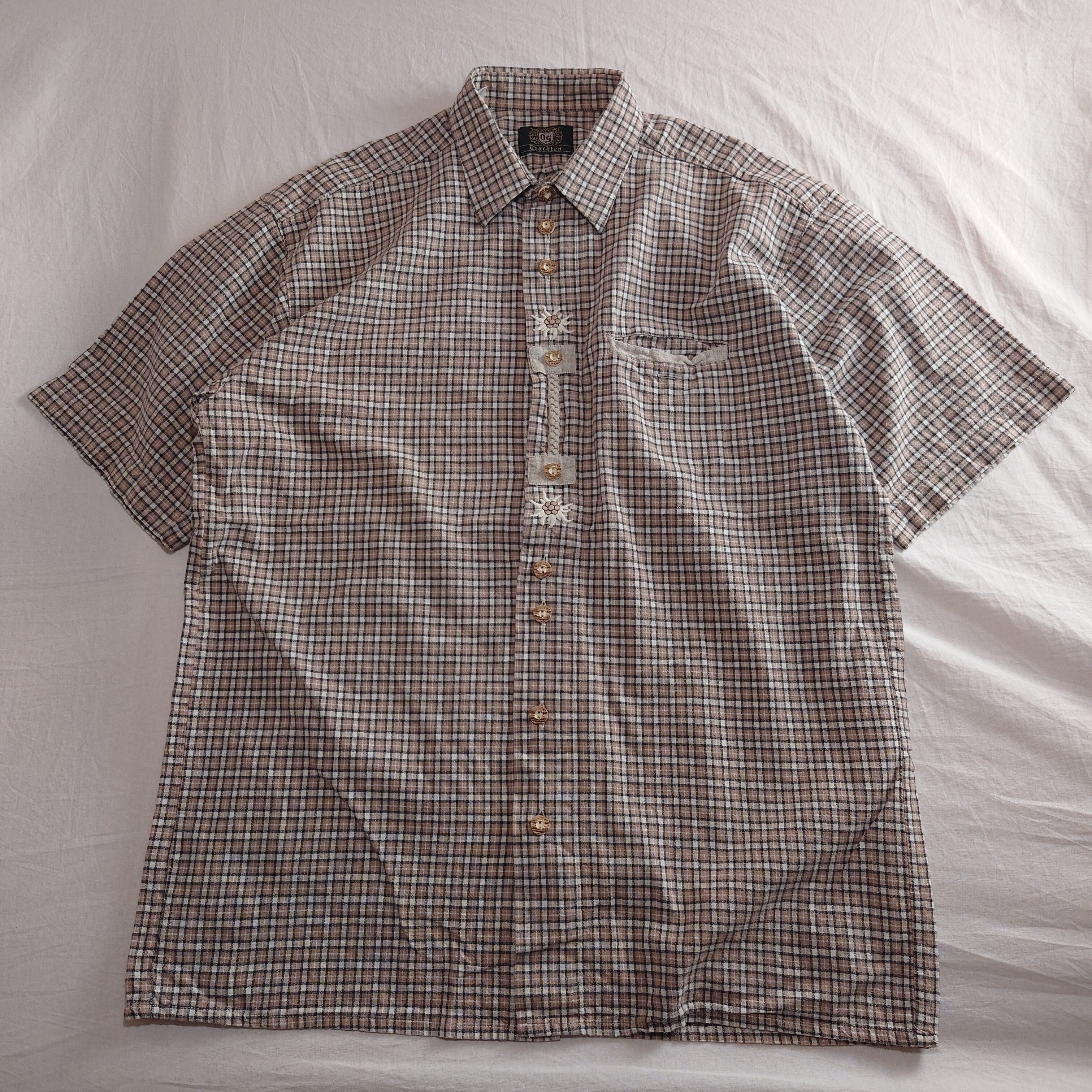 【雰囲気抜群】半袖チロリアンシャツ チェック柄 刺繍 ユーロ古着 花柄